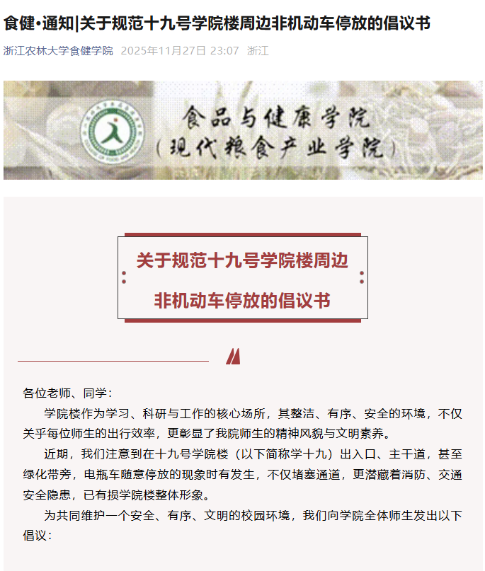 活动前,学院面向全体师生发布了《关于规范十九号学院楼周边非机动车停放的倡议书》,呼吁师生自觉将非机动车停放在指定区域,做到“入位、顺向、整齐”,共同维护学院楼出入口及主要通道的畅通,以实际行动争做文明校园的践行者和守护者。