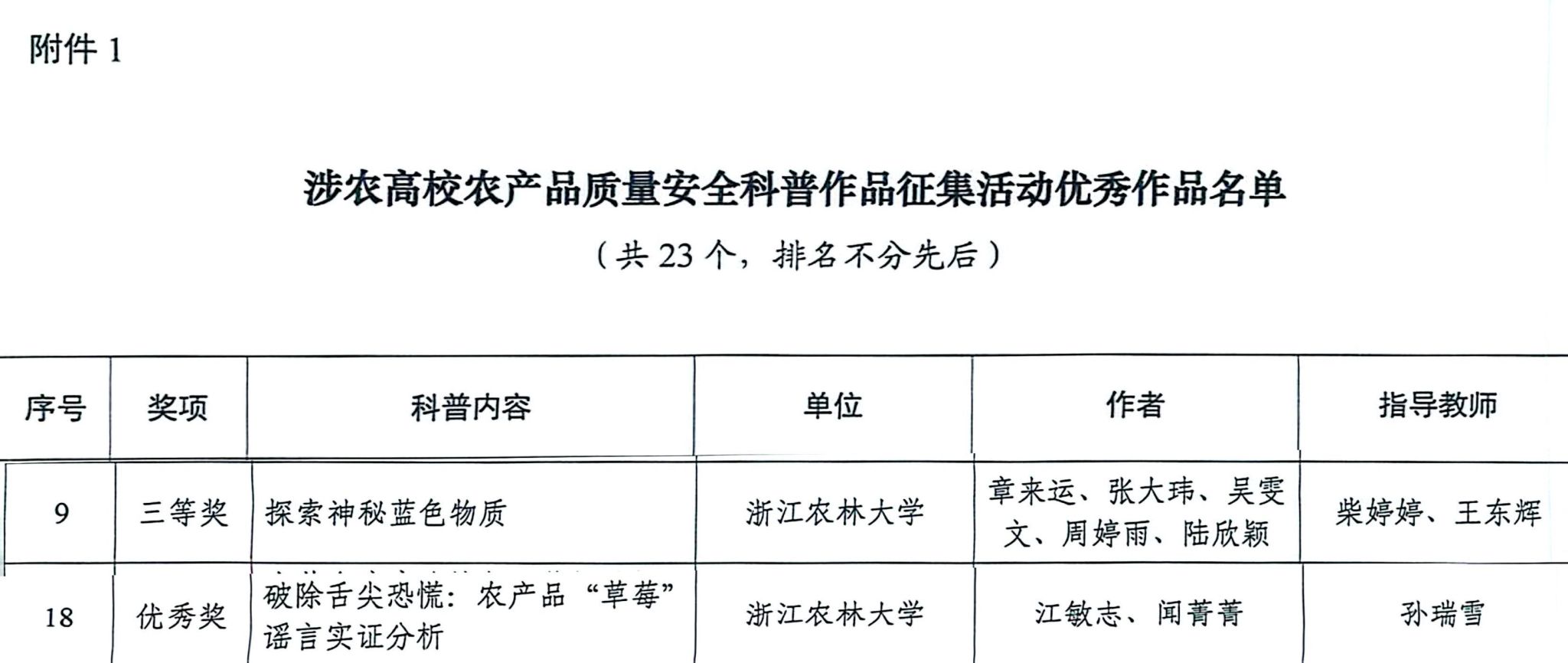 本次大赛旨在推动农产品质量安全科普进校园、进社会,凝聚共识,促进共治。由食健学院柴婷婷、王东辉老师指导的作品《探索神秘蓝色物质》,以及孙瑞雪老师指导的作品《破除舌尖恐慌:农产品“草莓”谣言实证分析》,立足专业、回应关切,以扎实的研究基础和生动的科普表达,有效解答公众疑问,充分展现了我校学子扎实的专业功底、严谨的科学态度和自觉的社会责任感。