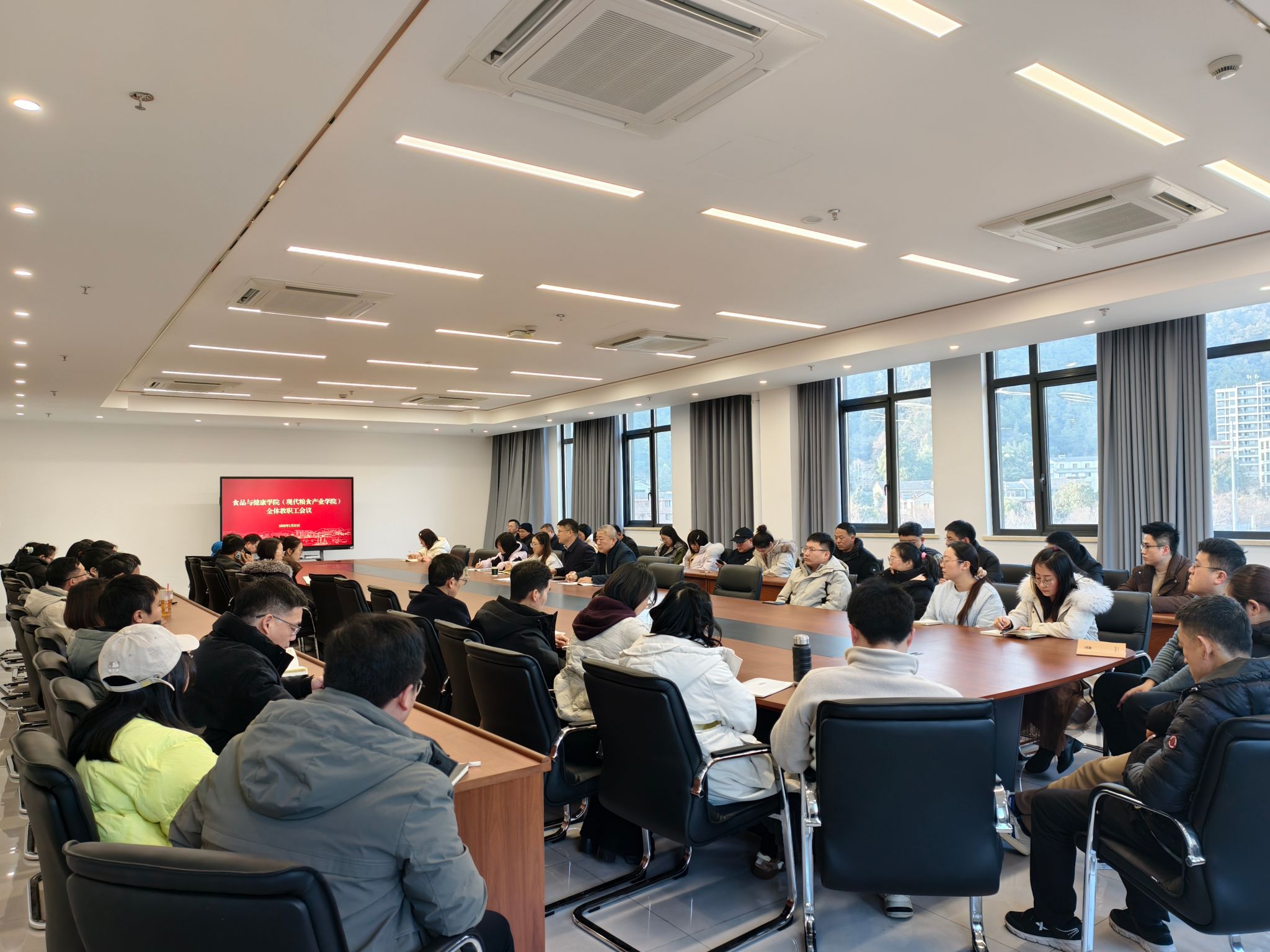 1月21日下午,食健学院召开全体教职工会议,举行学院领导班子述职,布置岁末年初相关工作。校党委组织部相关人员到会指导,学院党政班子成员、全体教师参加。