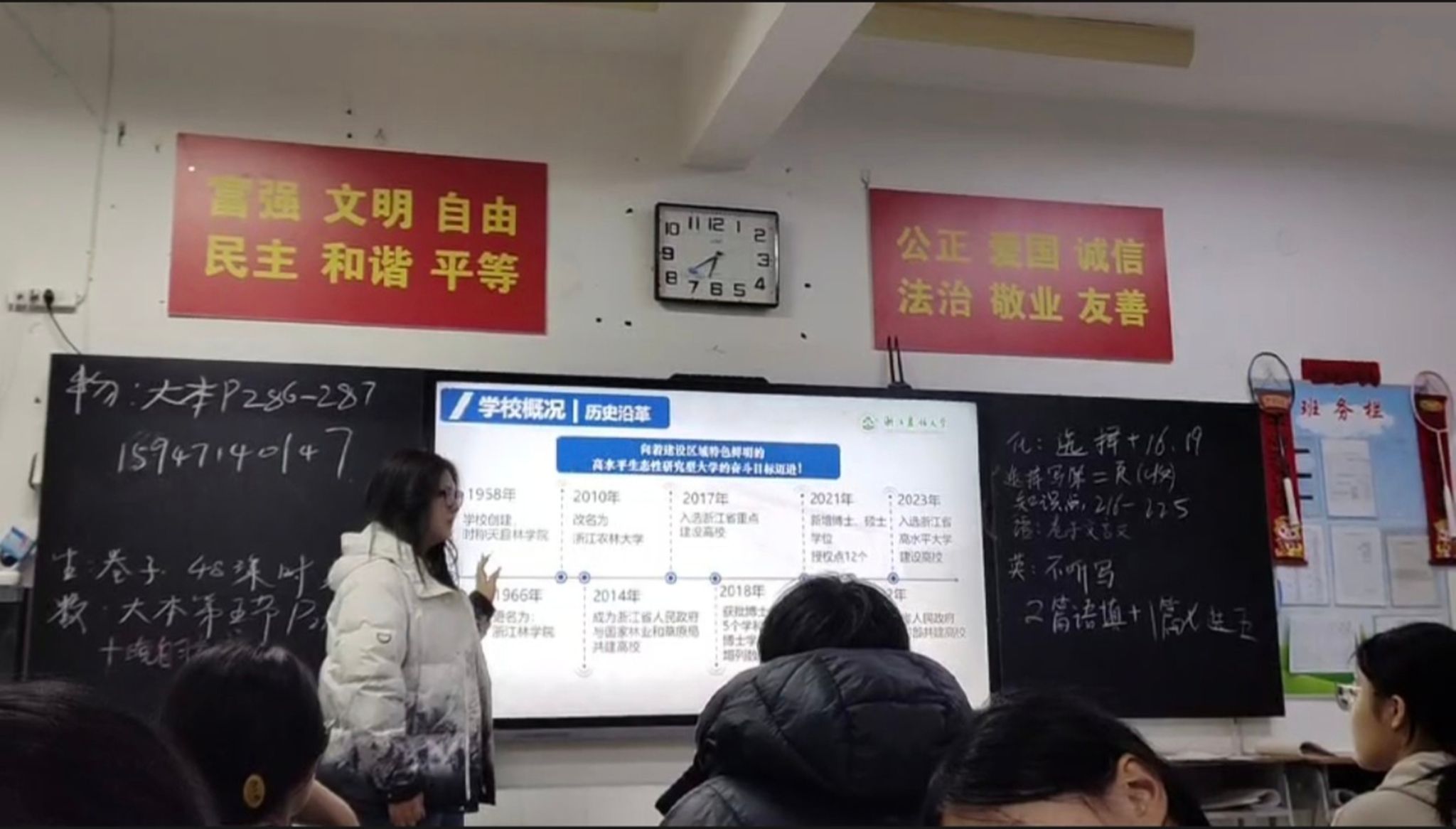 实践团以精心制作的学校宣传片,带领在场师生沉浸式领略了浙江农林大学的校园风光、优质教学设施和浓厚学术氛围。随后,团队成员通过系统讲解,详细介绍学校的办学历史、学科特色、师资队伍以及近年在人才培养方面取得的突出成就。